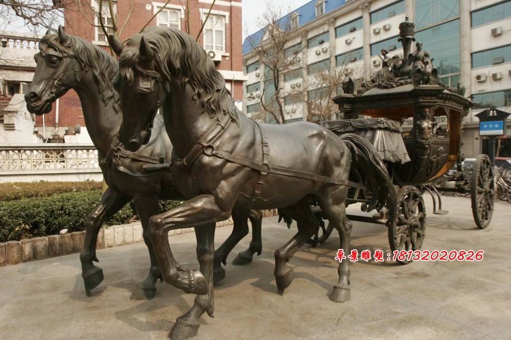 這種是鑄銅的仿古代馬車雕塑,通常安裝和擺放在草地上,這種馬拉車雕塑造價要低一些。