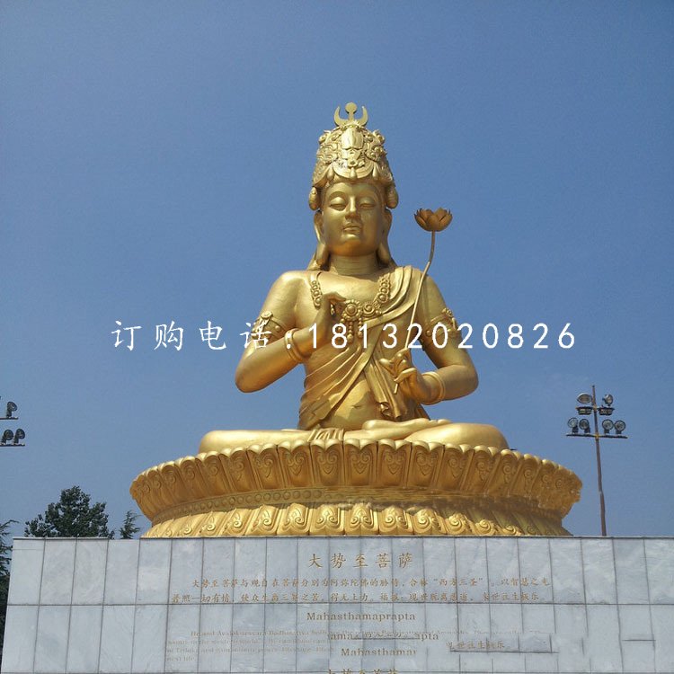尊上大勢至菩薩摩訶薩舉足行路時,十方世界的一切都會震動,而當大地震動的地方,會生出五百億寶華。一寶華都顯得高尚莊嚴,其莊嚴就像極樂世界一般。尊上 大勢至菩薩摩訶薩 坐下來時,首先七寶地面會一時為之搖動,然后逐漸擴展,下至金光佛國,上至光明王佛國都震動起來。上下兩國土之間出現塵數般無數的三尊之分身,全部都云集到極樂國土,充塞整個空中,坐于寶蓮花座上。據《阿喇多羅陀羅尼阿嚕力品》載,尊上 觀世音摩訶薩 大勢至菩薩摩訶薩 二大菩薩俱呈純金色白焰光,尊右手執白拂,尊左手執蓮花。于密教現圖胎藏界曼茶羅中,位于"觀音院"內列上方第二位。