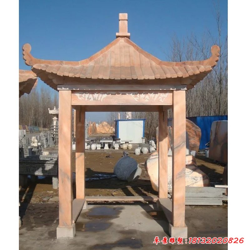 石雕涼亭作為一種景觀建筑,常常以空間環(huán)境主題的形式出現(xiàn),構成視覺景觀的趣味中心,讓人們從各個方向來欣賞。但是,他又不是一個實體,而是四面空靈,更多地強調(diào)其虛空的內(nèi)部與周圍的空間環(huán)境之間的聯(lián)系,并通過建筑造型的外在形象,在周圍空間中起到點睛的作用。它追求的是整體環(huán)境的空間美,所以,亭子具有點景和觀景的雙重作用。