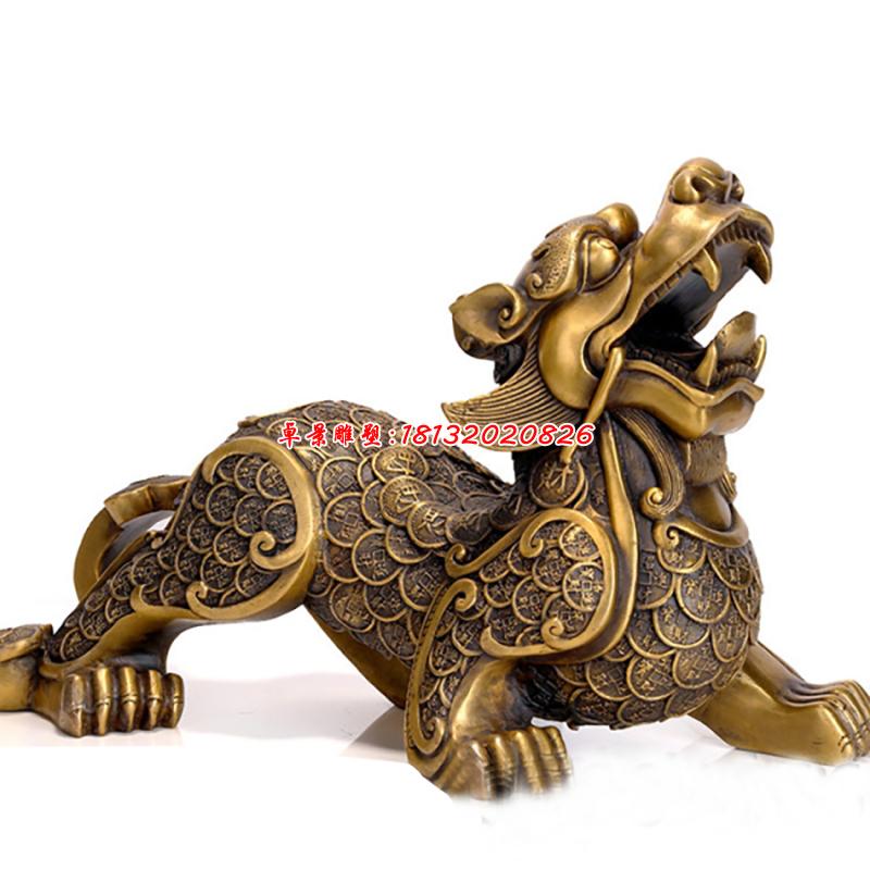 銅雕貔貅又名天祿、辟邪。是中國古代神話傳說中的一種神獸,龍頭、馬身、麟腳,形狀似獅子,毛色灰白,會飛。貔貅兇猛威武,它在天上負責的巡視工作,阻止妖魔鬼怪、瘟疫疾病擾亂天庭。古時候人們常也用貔貅來作為軍隊的稱呼。它有嘴無肛門,能吞萬物而從不瀉,可招財聚寶,只進不出,神通特異。